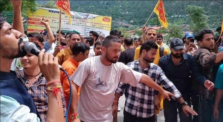 उत्तरकाशी। जनपद मुख्यालय में विभिन्न संगठन के लोग जिला प्रशासन के खिलाफ जुलूस प्रदर्शन करने पहुंचे। मस्जिद मोहल्ले के सामने नारेबाजी के साथ संगठन के लोगों ने प्रदर्शन किया। शुक्रवार को उत्तरकाशी मुख्यालय में विरोध प्रदर्शन करने उतरे लोगों ने मांस की दुकानों को बंद करने और अवैध मज्जिद ध्वस्त करने को लेकर नारे लगाई। कई पूर्व सैनिकों सहित टैक्सी यूनियन के लोग भी प्रदर्शन में शामिल हुए। जिलाधिकारी कार्यालय के बाहर पहुंची आक्रोश रैली ने खूब नारेबाजी की। इस दौरान भारी पुलिस बल मौजूद रहा। प्रदर्शनकारियों का आरोप है कि प्रशासन की लापरवाही के चलते देवभूमि की गरिमा को तार-तार किया जा रहा है। जिसे अब लोग बर्दाश्त नही करेंगे। उन्होंने प्रशासन से जल्द से जल्द उनकी मांगों पर कार्यवाही की मांग की है।