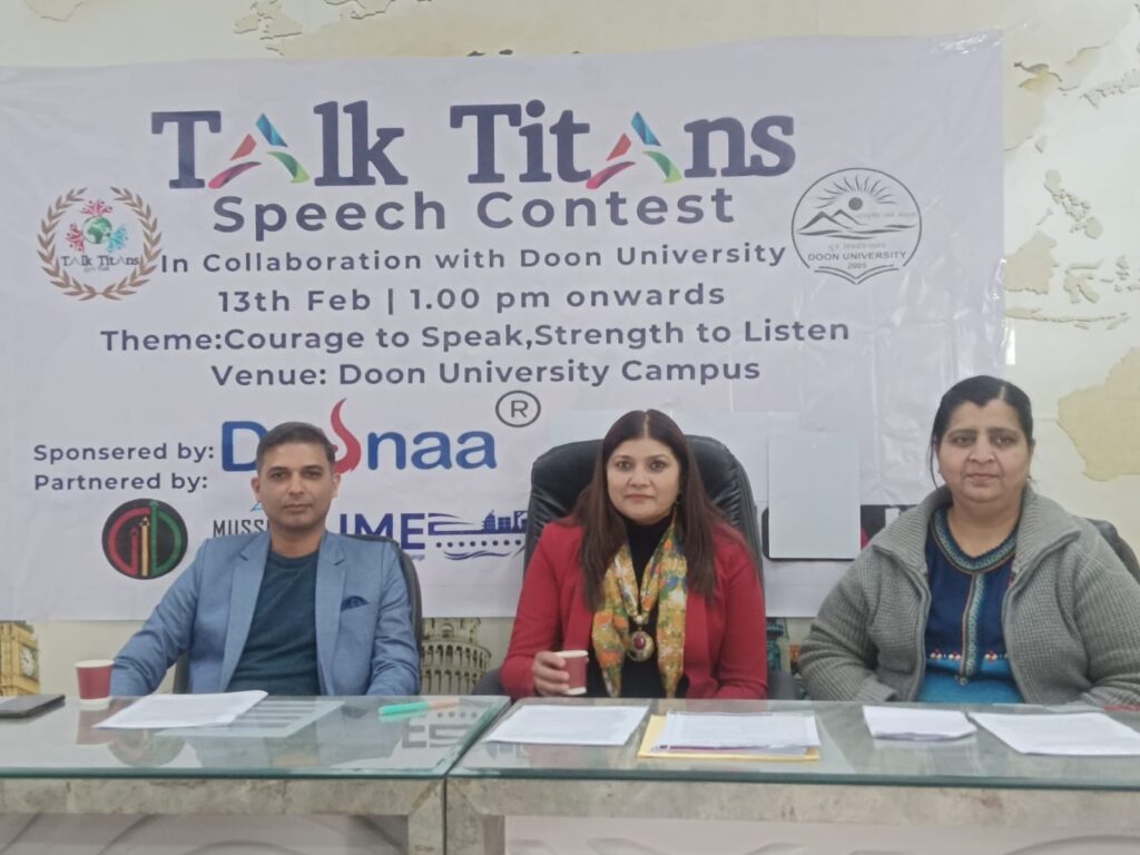 इसी उद्देश्य के साथ टॉक टाइटन की ओर से आगामी 13 फरवरी को दून यूनिवर्सिटी के सभागार में श् टॉक टाइटन स्पीच कॉन्टेस्ट श् का आयोजन कराया जा रहा है। कॉन्टेस्ट के सत्र का शुभारंभ यूनिवर्सिटी की कुलपति डॉक्टर सुरेखा डंगवाल की और से किया जाएगा।