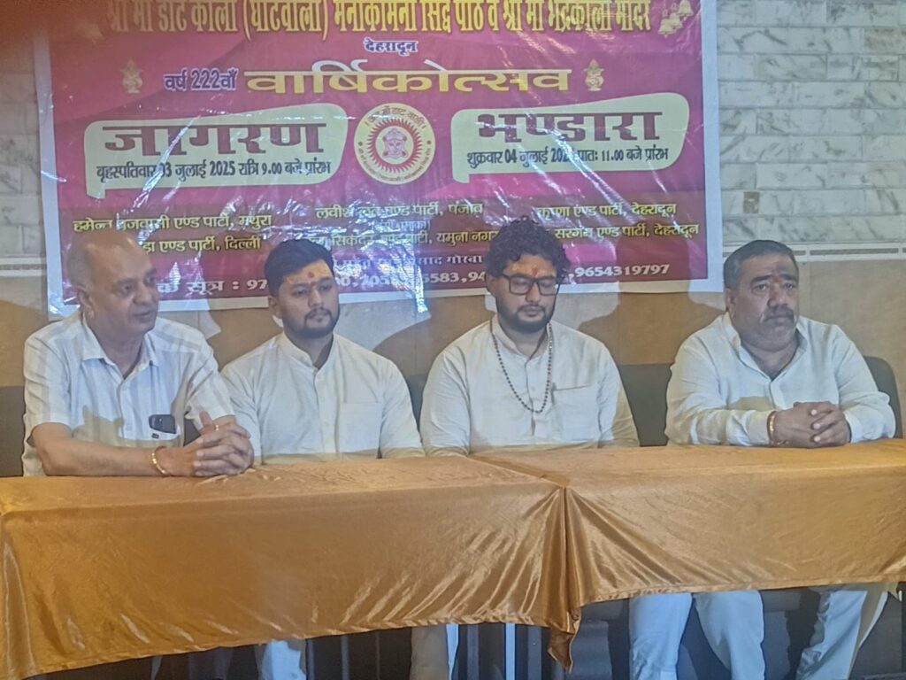 देहरादून,। मां डाट काली मनोकामना सिद्ध पीठ का 222वां वार्षिकोत्सव भैरव पूजा के साथ प्रारंभ हुआ। सोमवार को सुबह छह बजे आचार्यों द्वारा शिव पूजा की गई। 1 जुलाई को सायं मंदिर परिसर में सुंदर कांड का पाठ प्रसिद्ध गायक हरिपाल आहूजा द्वारा किया जाएगा। 2 जुलाई को झंडा परिक्रमा सुभाषनगर से प्रारंभ होगी। 3 जुलाई को माता रानी का भव्य जागरण रात्रि 9 बजे प्रारंभ होगा। 4 जुलाई को मां का विशाल भंडारा पूर्वाह्न 11 बजे से प्रारंभ होगा। माता रानी के भजनों का गुणगान हेमंत बृजवासी, पप्पू अरोड़ा, मन्नु सिकन्दर, मनोज सरगम एंड पार्टी द्वारा किया जाएगा। इस वार्षिकोत्सव में देश-विदेश से मां के भक्त मंदिर आते हैं। इस बार फूलों की सजावट एवं बिजली की सजावट मुख्य आकर्षण है। यातायातकी समस्या को देखते हुए शोभायात्रा सुभाषनगर से मंदिर के लिए प्रस्थान करेगी ताकि आम जन मानस को असुविधा से बचाया जा सके। वार्षिकोत्सव कार्यक्रम की जानकारी देने के लिए दर्शनी गेट स्थित एक होटल में मंदिर के महंत रमन प्रसाद गोस्वामी के पुत्र शुभम गोस्वामी एवं संयम गोस्वामी के सानिध्य में पत्रकार वार्ता आयोजित की गई। पत्रकार वार्ता को दिनेश अग्रवाल एवं गौरव कुमार द्वारा संबोधित किया गया। इस मौके पर शिवम गोयल, विक्की प्रजापति वासू, परविन्दा आदि उपस्थित रहे।