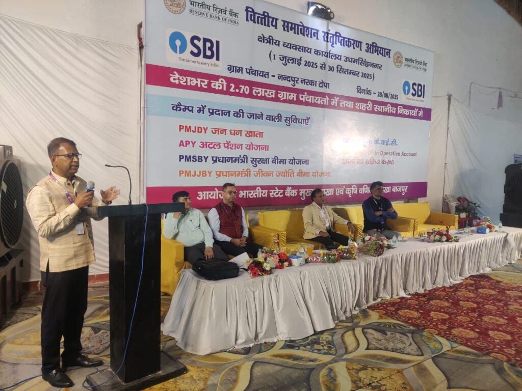 देहरादून,। भारतीय स्टेट बैंक, शाखा बाजपुर के सौजन्य से सैचुरेशन कैम्प का आयोजन किया गया। इस अवसर पर मुख्य अतिथि के रूप में अरविंद कुमार, क्षेत्रीय निदेशक, भारतीय रिज़र्व बैंक, उपस्थित रहे। कार्यक्रम में विशेष रूप से राजीव रंजन, उप महाप्रबंधक, एसबीआई हल्द्वानी; संजीव कुमार, क्षेत्रीय प्रबंधक, एसबीआई क्षेत्रीय व्यवसाय कार्यालय ऊधमसिंहनगर; रजनीश सैनी, एल.डी.ओ., भारतीय रिज़र्व बैंक देहरादून; चिराग पटेल, प्रमुख जिला प्रबंधक (एल.डी.एम.), ऊधमसिंहनगर; प्रेम सिंह, मुख्य प्रबंधक, एसबीआई हल्द्वानी; महिमन सिंह, प्रबंधक एसबीआई रुद्रपुर; लोकेश पंत, शाखा प्रबंधक एसबीआई बाजपुर तथा कुबेर दत्त, शाखा प्रबंधक कृषि शाखा बाजपुर सम्मिलित हुए। इस कार्यक्रम में लगभग 250 लोगों की उपस्थिति रही, साथ ही स्थानीय क्षेत्र की 6 से 7 ग्राम पंचायतों के ग्राम प्रधानों ने भी भागीदारी की।