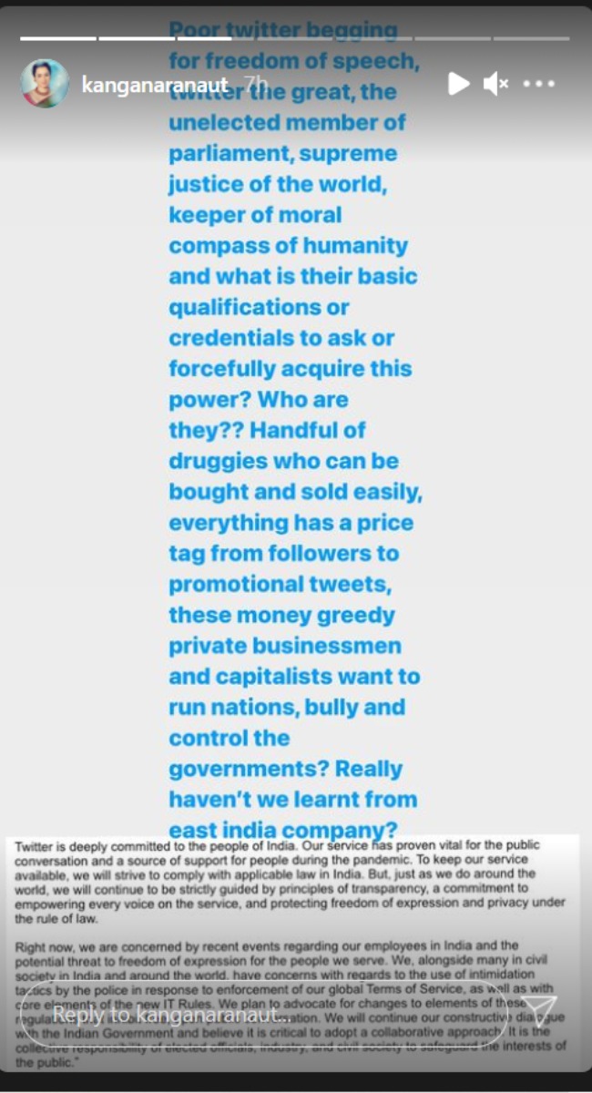 गुरुवार को कंगना ने इंस्टा स्टोरी के ज़रिए फिर से ट्विटर की ख़बर ली। उन्होंने ट्विटर को मुट्ठीभर नशेड़ियों का समूह और पैसों के लिए लालची करार दिया। दरअसल, कंगना के भड़कने की वजह ट्विटर का एक स्टेटमेंट बना, जिसमें कम्पनी ने क़ानूनी दायरे में रहकर लोगों की अभिव्यक्ति की आज़ादी और निजता की रक्षा करने की बात कही है।
