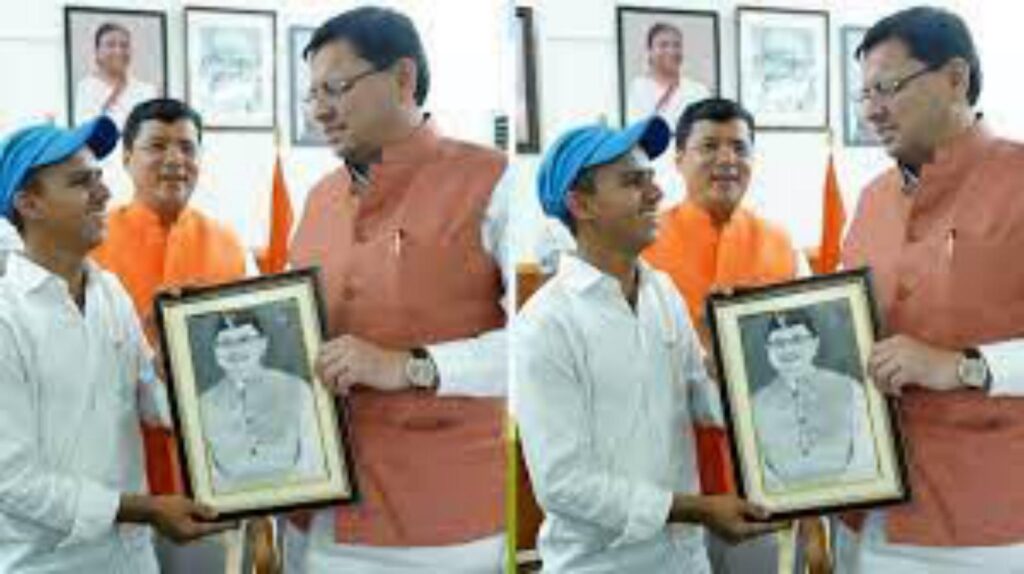 मुख्यमंत्री पुष्कर धामी को पेंटिंग प्रदान करते हुए मुकेश राम
